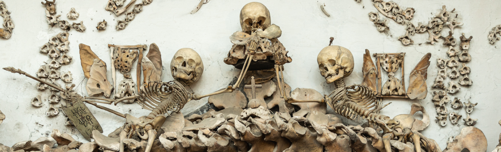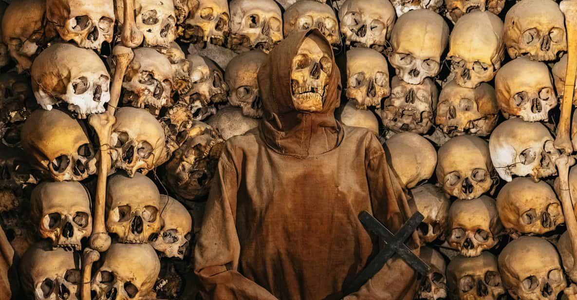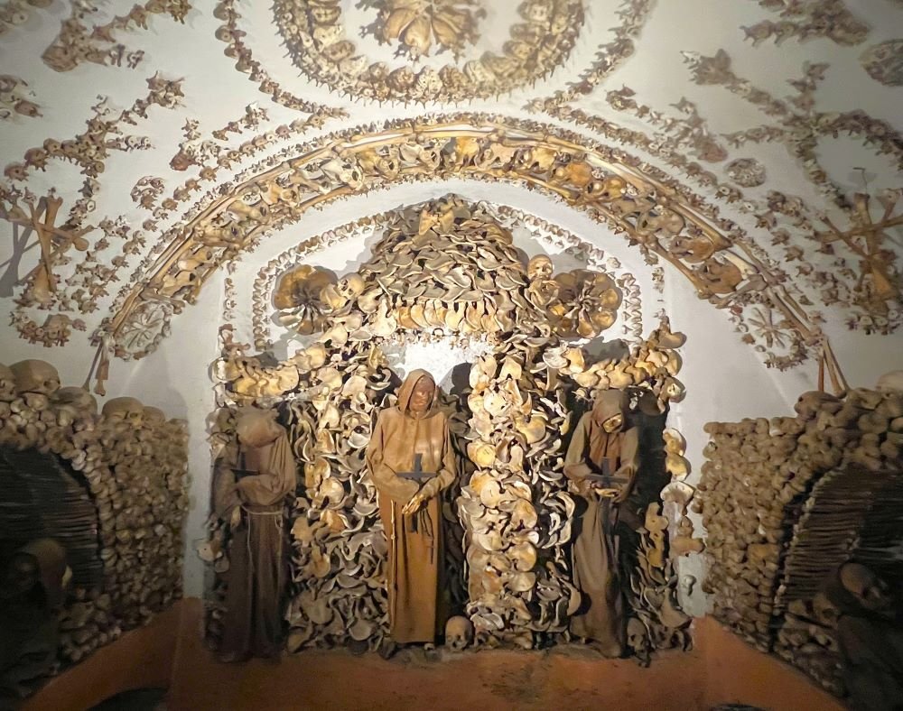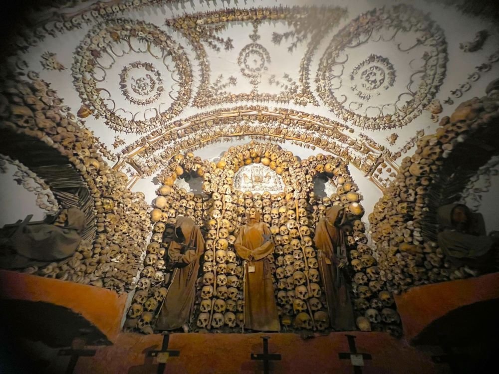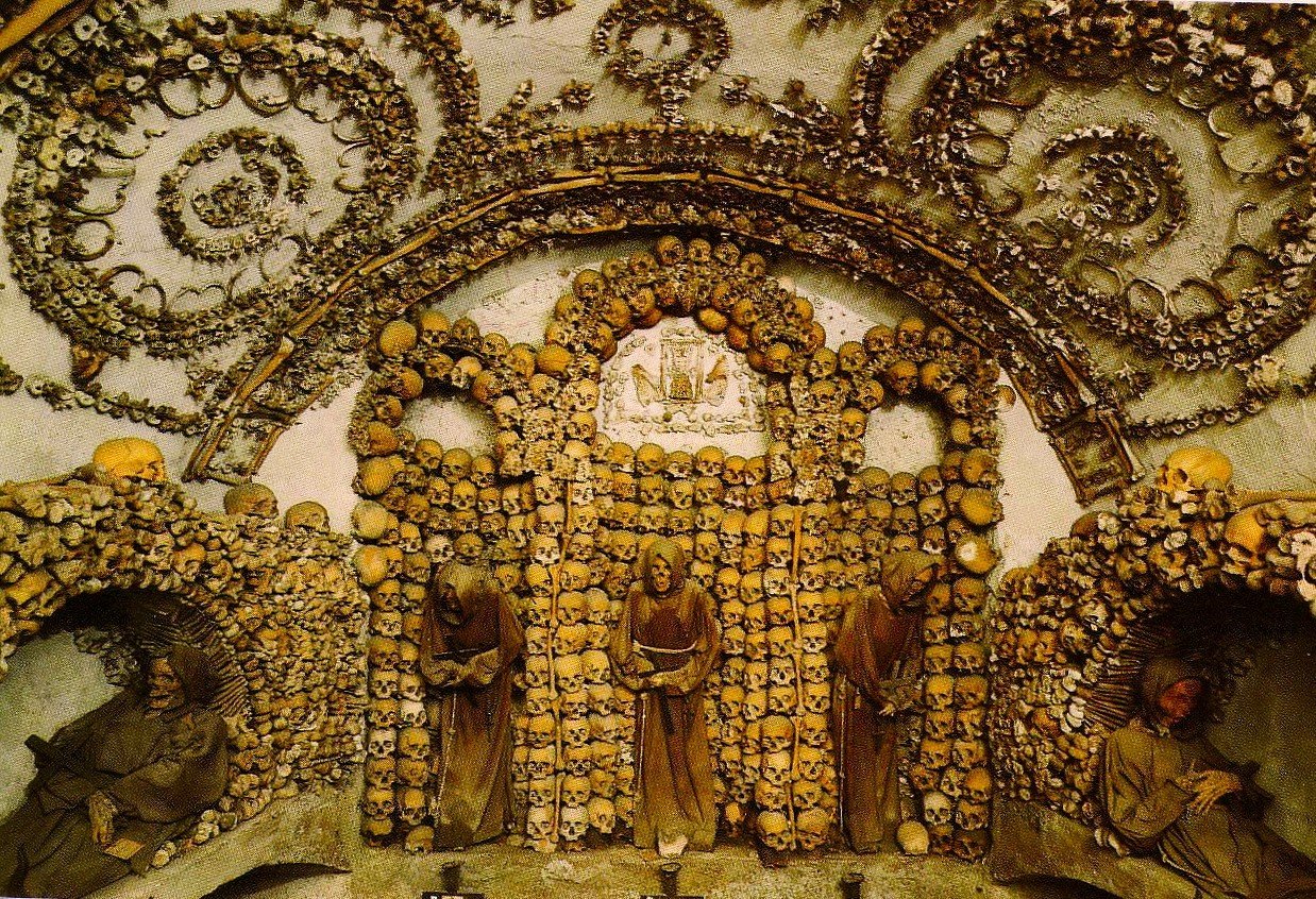Uno dei luoghi più affascinanti e misteriosi di Roma è la Cripta dei Frati Cappuccini in via Veneto, nei sotterranei della Chiesa di Santa Maria della Concezione. Si tratta di una vera e propria “opera d’arte macabra”, decorata con le ossa di 4.000 frati cappuccini morti tra il 1500 e il 1800. Un monumento funebre realizzato a metà del Settecento da un artista sconosciuto, che disseminò le sei cappelle della Cripta di simboli del memento mori (monito latino che letteralmente significa “ricordati che devi morire”), tutti realizzati con ossa umane, tra cui orologi ossei e clessidre alate, simboli dell’ineluttabilità della vita umana, e uno scheletro che in una mano tiene una falce e nell’altra una bilancia, a rappresentare l’inevitabilità della morte e la giustizia divina. Alle pareti sono ammassate migliaia di tibie, teschi e femori a creare altari, nicchie, archi e altre strutture architettoniche presidiate da inquietanti scheletri vestiti con il saio francescano, che attendono minacciosi il visitatore. Alcune cappelle sono caratterizzate dall’uso prevalente di un osso in particolare e ne portano il nome: la Cappella delle Tibie e dei Femori, la Cappella dei Bacini e la Cappella dei Teschi. Anche la volta della Cripta è sontuosamente decorata con ossa umane: lampadari di vertebre, fiori, stelle e croci di tibie e peroni, farfalle di falangi e coccigi, rosoni e lesene di costole e clavicole.